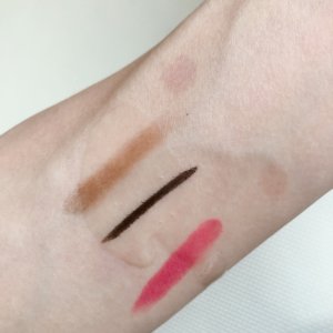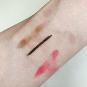 上からアイシャドー、アイライナー、口紅です。